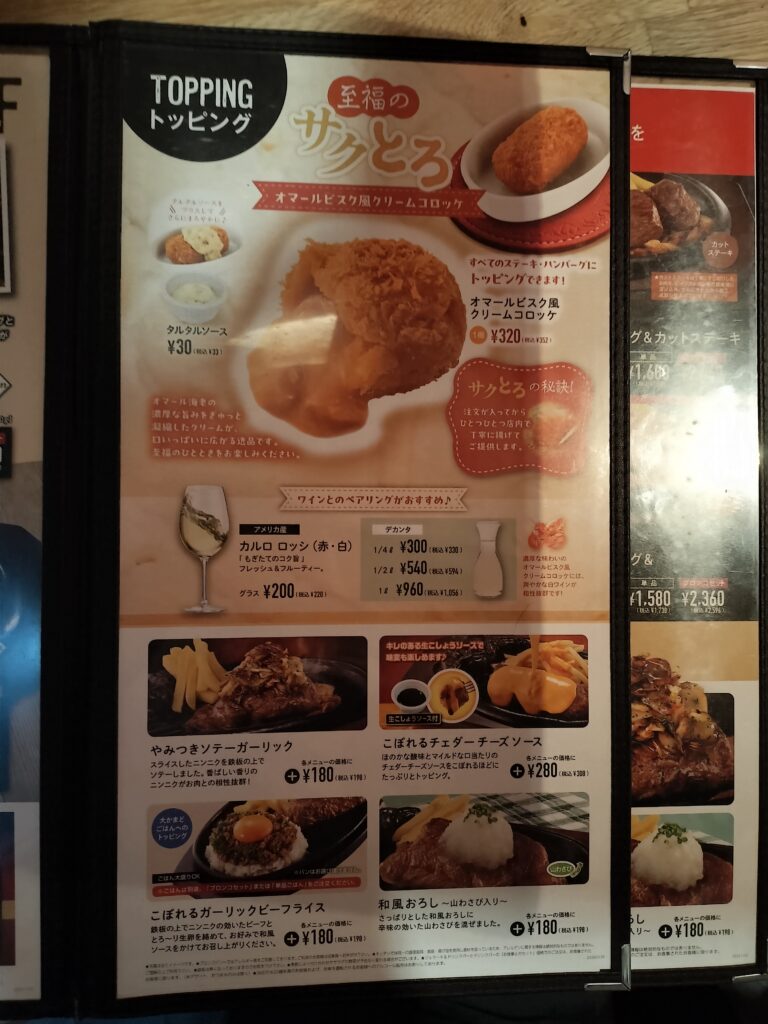 ビールはプレモル。ステーキハウスなので、赤ワインの種類が豊富でした。おつまみ系のメニューはからあげのみっぽかったです。サラダバーをつまみにしていましたが、トッピングメニューにクリームコロッケがあったので注文。