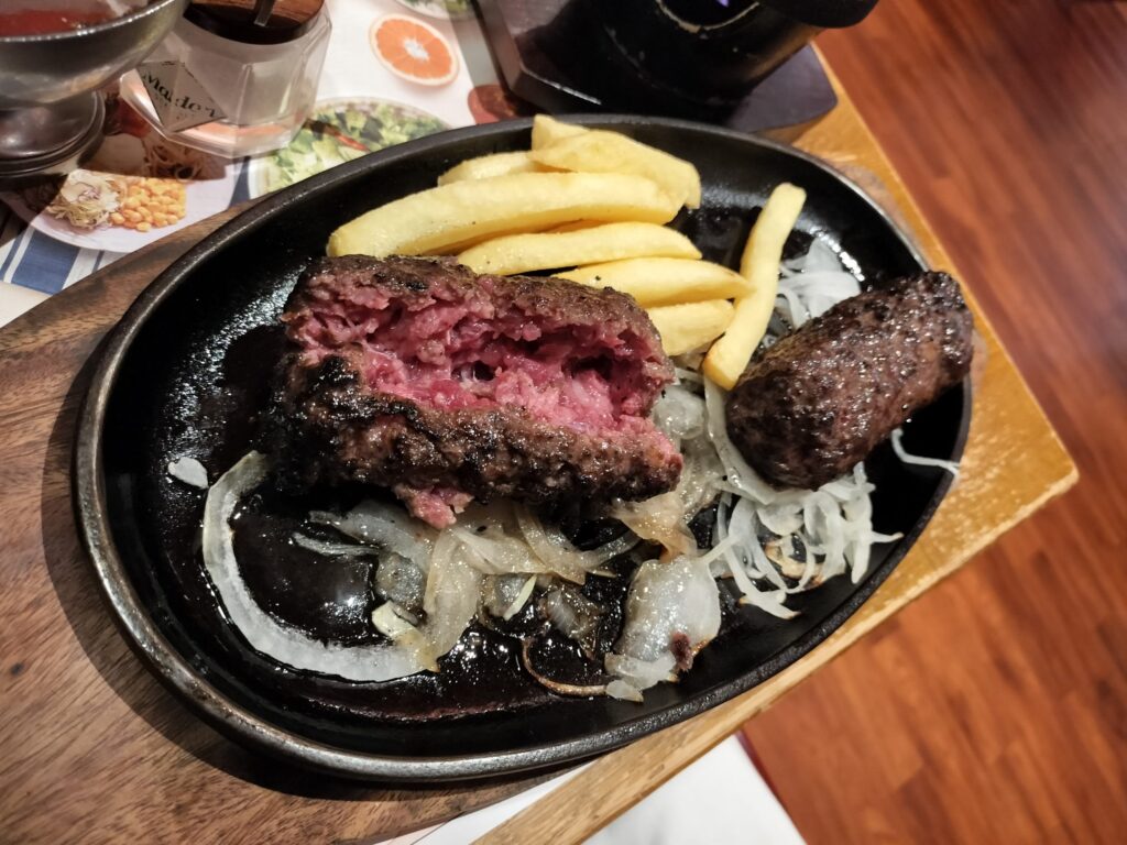 ハンバーグを割ると、中はほぼレア。別に鉄板が付いてくるのでお好みで焼きながら食べるスタイルです。
